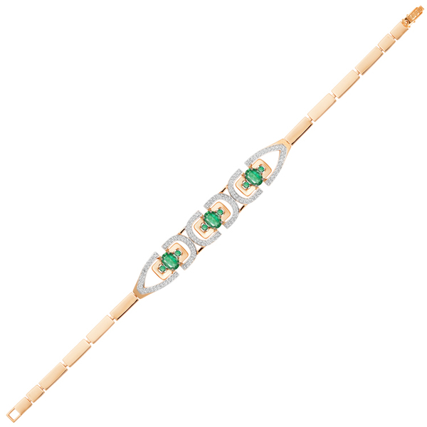 Роскошный браслет с изумрудами — ода благородству формы и цвета. Насыщенные камни, заключённые в тончайшее обрамление из золота и фианитов, формируют выразительный центр композиции, где каждая грань отражает свет с утончённой точностью. Чёткая архитектура линий сочетается с мягкой текучестью звеньев, создавая идеальный баланс между графичностью и женственностью. Это украшение раскрывается особенно красиво в дуэте с гладкими вечерними тканями — шёлком, атласом. Украшение, которое говорит языком уверенной элегантности.