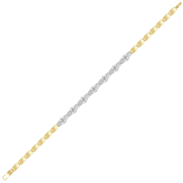 Изысканная игра оттенков в минималистичном дизайне — браслет, сочетающий тёплое сияние лимонного золота и прохладу белого золота, украшенного тонкой инкрустацией фианитов Swarovski. Чёткие прямоугольные звенья мягко ритмизируют образ, создавая утончённый баланс между структурой и блеском. Этот браслет — идеальный акцент для повседневной элегантности, который легко гармонирует с другими украшениями, подчёркивая вкус и стиль.