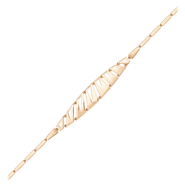 Геометричный браслет из красного золота. Браслет скульптурной формы, выверенной до миллиметра. Гладкие звенья выстроены в изящную градацию: от меньших к крупным и обратно — с ритмом, напоминающим архитектуру ар-деко. Внутренние грани украшены утопленными треугольными элементами, создающими тонкую игру света и тени. Абсолютная чистота линий, безупречный блеск металла — сдержанная роскошь в каждой детали.