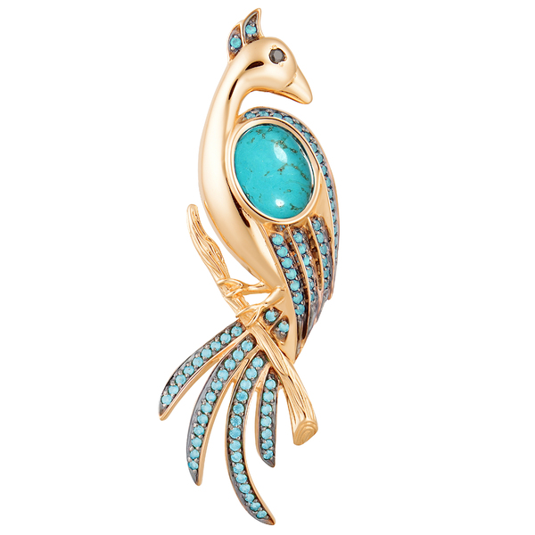Изящная брошь в виде птички, устроившейся на тонкой ветке — украшение, полное нежности и света. Главный акцент — бирюза, сияющая в центре, а её крылышки украшены фианитами в тон, что создаёт мягкую игру цвета и блеска. Линии плавные, утончённые, словно птичка замерла в момент тишины. Брошь выглядит воздушной и живой, будто создана для лёгкого, вдохновляющего образа. Идеальный штрих к наряду, в котором хочется говорить только шёпотом.