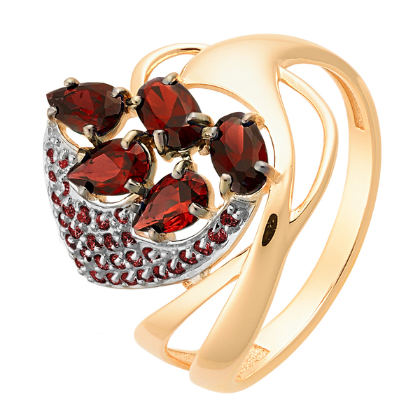 Элегантное кольцо с гранатами – воплощение утонченной роскоши и изысканного вкуса. Бордовые камни огранки «груша» и «овал», подобно каплям рубинового вина, переливаются глубокими оттенками, подчеркивая благородство дизайна. Тонкий контур красного золота обрамляет композицию, добавляя легкость и воздушность, не умаляя при этом величия украшения. Игра света фианитов в цвет камня и теплый блеск драгоценного металла создают эффект живого пламени, завораживающего взгляд.