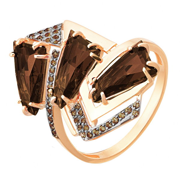 Эффектное кольцо с раух-топазами насыщенного коньячного оттенка — выбор для тех, кто ценит выразительность формы и глубину цвета. Геометричная композиция дополнена сиянием фианитов, создающим объём и блеск в каждом изгибе. Украшение притягивает взгляд и легко становится акцентом в образе — как вечернем, так и повседневном.
