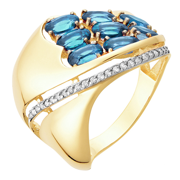 Кольцо в стиле модерн из желтого (лимонного) золота приковывает взгляд благодаря зеркально отполированной, немного выпуклой поверхности и выглядит как тщательно продуманная композиция света и формы. Лондон топазы, расположенные четко по рядам, придают изделию статусность и строгость. Белые фианиты придают блеска и сияющего, уместного дополнения ко всей композиции. Кольцо не нуждается в сопровождении других изделий и точно не останется незамеченным.