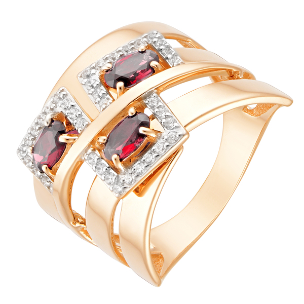 Широкое кольцо из золота украшено тремя выразительными камнями в насыщенном красно-розовом оттенке, подчёркивающими лаконичную симметрию изделия. Каждый камень обрамлён аккуратной квадратной инкрустацией из сверкающих фианитов, придающей кольцу архитектурную чёткость и лёгкий блеск. Гармоничное сочетание цвета и формы делает украшение универсальным — оно подходит как для будней, так и для торжественных случаев. Посадка комфортная, изделие уверенно смотрится на руке и дополняет образ сдержанной элегантностью. Это украшение — о вкусе, который не требует слов.