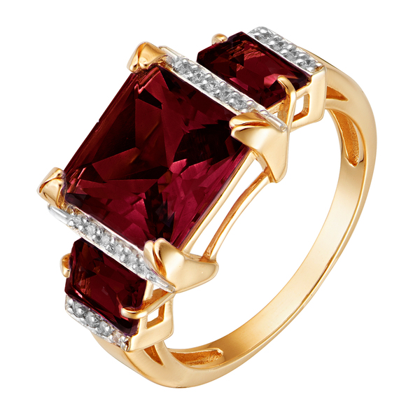Центральный акцент — крупный ситал-гранат насыщенного винного оттенка. Камень обрамлён дорожками фианитов, подчёркивающими его чистую вертикаль. Композицию дополняют боковые вставки гранатов прямоугольной огранки, выстроенные симметрично и точно. Эффектное, статусное кольцо с выверенной геометрией и глубоким цветом.