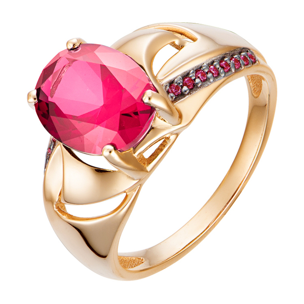 Золотое кольцо с синтетическим рубином сочетает в себе выразительность цвета и изящную графику формы. По диагонали камень пересекает дорожка фианитов в тон, создавая ощущение движения и глубины. Небольшие завитки добавляют украшению мягкости и намека на классику. Это кольцо — про королевский минимализм: яркое, но сдержанное, благородное, но не вычурное. Идеально для тех, кто ценит форму и силу цвета без лишней громкости.