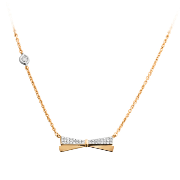 Колье из красного золота с утончённой подвеской в форме банта — нежное и эстетичное украшение. Верхняя часть бантика усыпана сияющими бриллиантами, добавляющими лёгкий блеск и изящество. Нижняя часть выполнена из гладкого золота, что создаёт красивый контраст фактур. Линии украшения тонкие, выверенные, как будто нарисованы кистью. Идеальный акцент для тех, кто выбирает элегантность без лишнего пафоса.