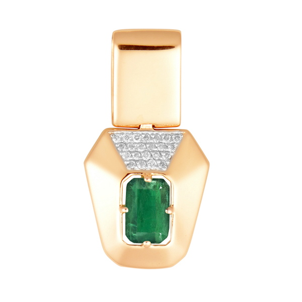 Золотая подвеска с изумрудом огранки «изумруд» — лаконичное, но запоминающееся украшение. Особую выразительность ей придаёт верхння обсыпка из сияющих фианитов, которая пересекает форму и добавляет динамики. Благодаря нестандартному геометричному силуэту подвеска выглядит современно и легко — для тех, кто ценит детали даже в самых простых вещах.