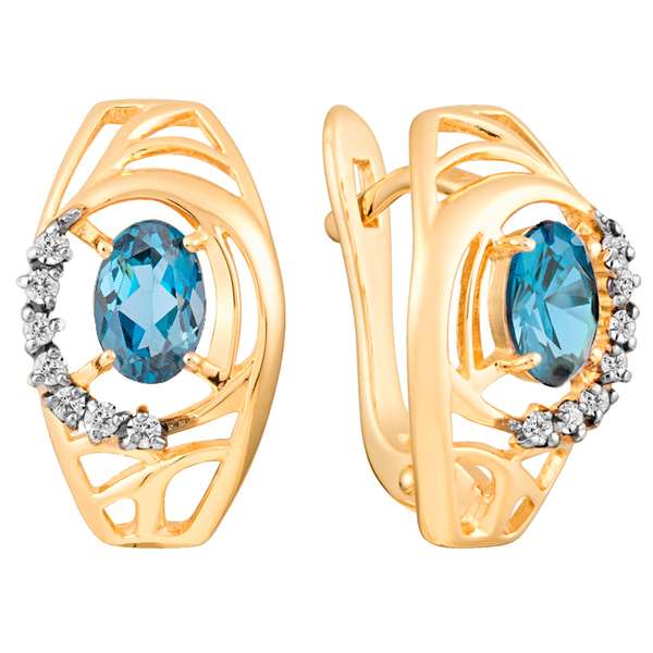 Глубокие лондон топазы овальной огранки — в центре изящной, почти архитектурной композиции. Камни обрамлены сияющей дугой белых фианитов, выстроенных с лёгким интервалом, будто отражающих свет на поверхности воды. Широкие основания серег украшены тончайшими металлическими узорами, создающими ощущение воздушной графики. Лаконичная форма подчёркивает баланс формы и света — строгое, но чувственное украшение.