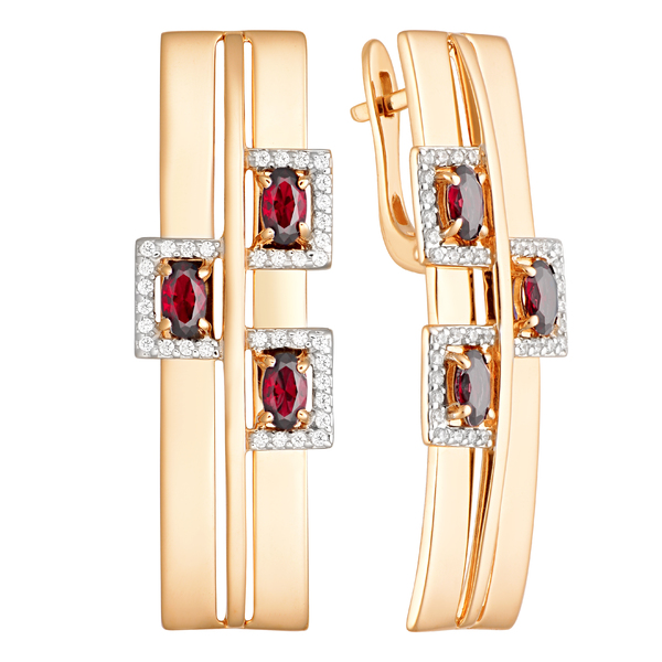 Серьги из золота украшены тремя выразительными камнями в насыщенном красно-розовом оттенке, подчёркивающими лаконичную симметрию изделия. Каждый камень обрамлён аккуратной квадратной инкрустацией из сверкающих фианитов, придающей серьгам архитектурную чёткость и лёгкий блеск. Гармоничное сочетание цвета и формы делает украшение универсальным — оно подходит как для будней, так и для торжественных случаев. Посадка комфортная, изделие уверенно смотрится и дополняет образ сдержанной элегантностью. Это украшение — о вкусе, который не требует слов.