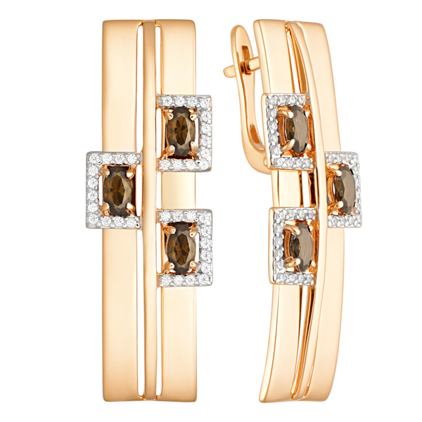 Серьги из золота украшены тремя выразительными камнями в насыщенном коньячном оттенке - раух-топазами, подчёркивающими лаконичную симметрию изделия. Каждый камень обрамлён аккуратной квадратной инкрустацией из сверкающих фианитов, придающей серьгам архитектурную чёткость и лёгкий блеск. Гармоничное сочетание цвета и формы делает украшение универсальным — оно подходит как для будней, так и для торжественных случаев. Посадка комфортная, изделие уверенно смотрится и дополняет образ сдержанной элегантностью. Это украшение — о вкусе, который не требует слов.