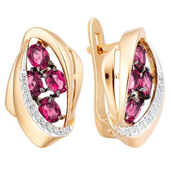 Серьги выполнены из красного золота с яркими синтетическими рубинами. Четыре рубина расположены асимметричным каскадом, создавая динамичный и притягивающий акцент. Оправа плавно входит в удобную шинку, обеспечивая комфорт при ношении. Белые дорожки из фианитов сверкают, притягивают взгляд и подчеркивает красочность камней. Эти серьги созданы для особых случаев. Они идеально дополнят вечернее платье глубокого черного, бордового или изумрудного цвета.